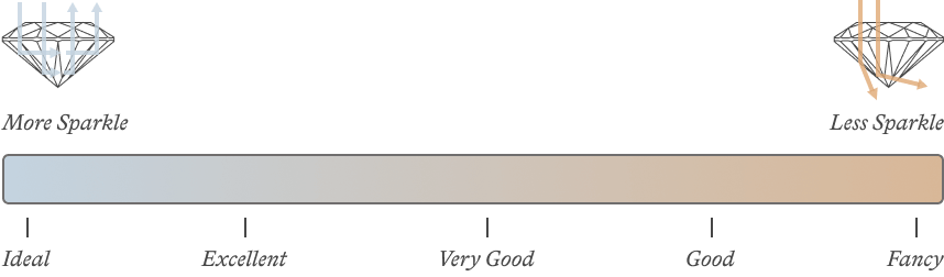 Cut refers to how well a diamond’s facets interact with light, resulting in their level of sparkle. A stone’s facets will be measured to examine brightness, fire and scintillation.
